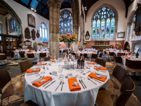 It boasts a stunning location close to the riverside and provides a truly memorable setting for your event. It features soaring columns and wonderful architectural features, with atmospheric light from the stained glass windows which makes for a dramatic and unique venue.