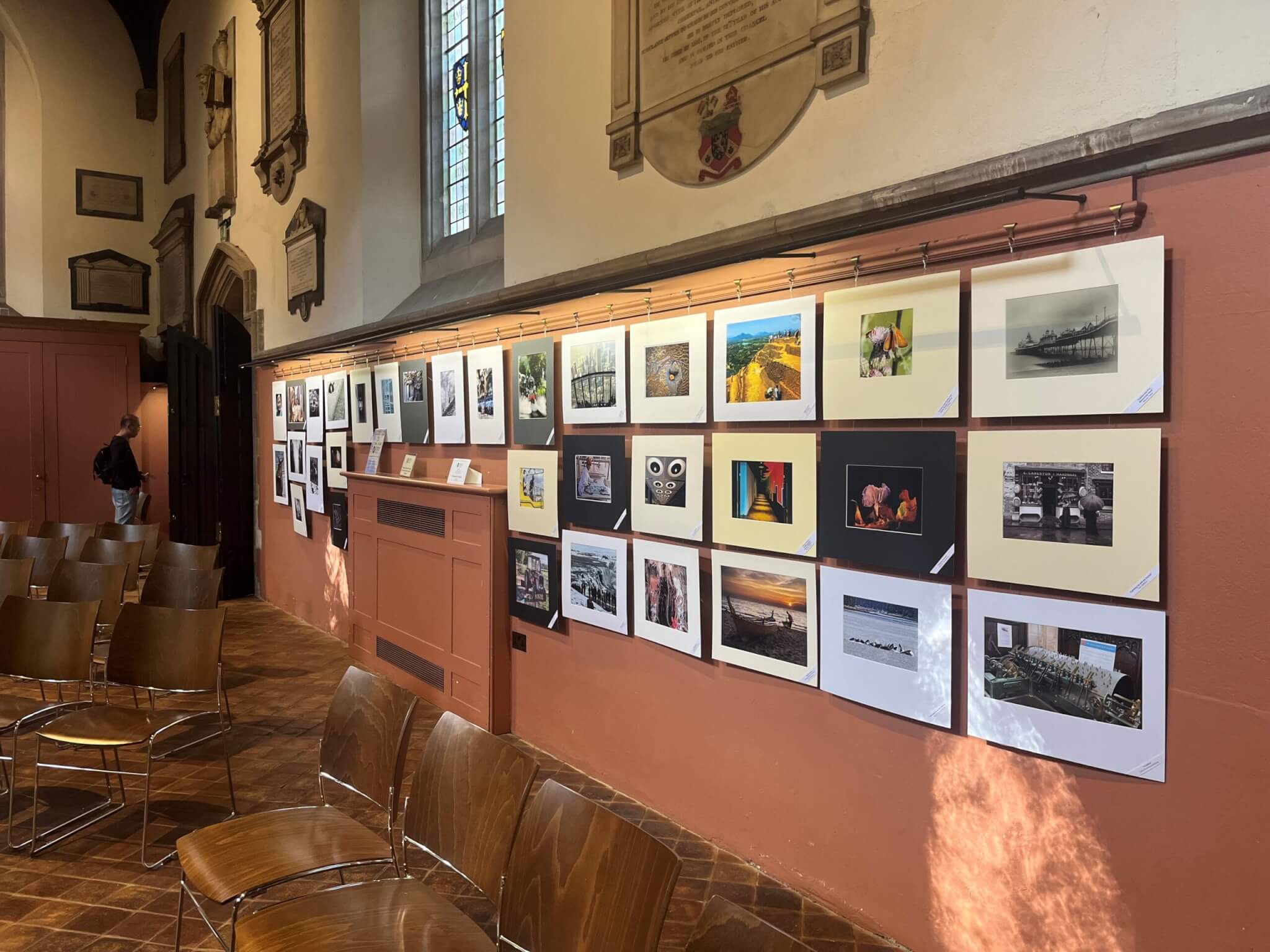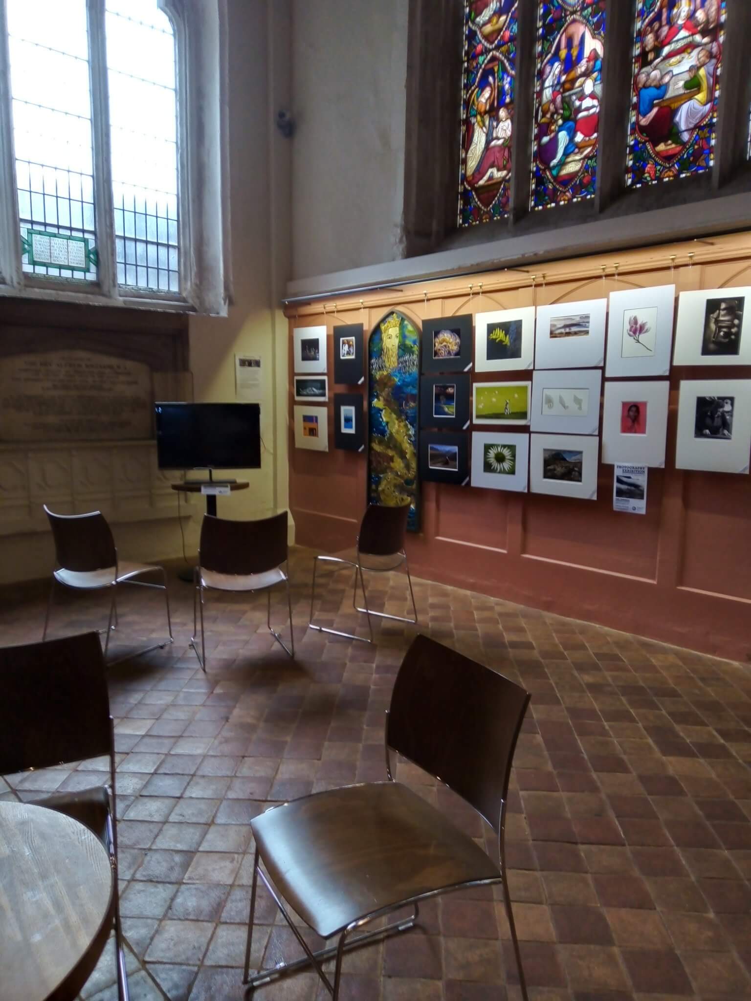 - the nave – there are two walls which can be hired for exhibitions. Any work would need to be hung on picture rails via standard brass picture hooks. Slimline lighting strip runs the length of the picture rail to highlight our banners or your exhibition.